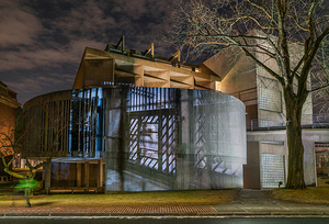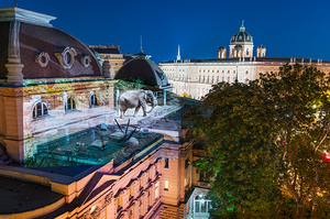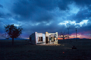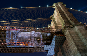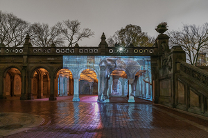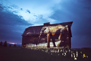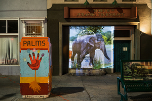 Since 2014, making the video, Plumb has traveled to over sixty zoos in the US and Europe, filming elephants exhibiting what biologists refer to as stereotypy, a behaviour only seen in captive animals that includes rhythmic rocking, swaying and head bobbing. These compulsive, repetitive movements cause debilitating damage to the animals feet and joints. Plumb practices a sort of guerrilla performance with her videos, setting up a portable projector, often powered by a battery pack, in urban and rural locations around the world. Focusing the work on buildings, mountains, barns or any other sort of sturcture, she documents the moment with a still photograph, as seen here. The projection often creates a moment of shared interaction with passers-by (and somtimes the authorities) and Plumb is able to engage in a conversation about her larger concerns for the well-being of these magnificent animals.