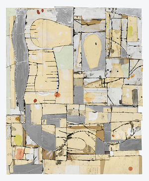 Gordon Powell’s assemblages are the epitome of abstraction, with shapes and tones composed according to the artist’s own intuitive combination of visual tension and harmony —an all-over-ness occupying that sweet spot where form is free from representation. Powell is a master of improvisation, so it’s a striking contradiction that this newest collection in “Stray Cats,” eight works of paper, paint, wood and glue, begins with guidelines, quite literal ones. The Manila paper collage pieces bear handwritten arrows and annotations, and shapes delineated with someone else’s sure-handed graphite marks. These are patterns: pages of flat forms to be cut-out and constructed into a three-dimensional whole. It’s not important what the patterns were intended to become; Powell merely uses them as his stimulus, subsequently obliterating them during his process.